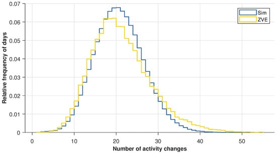 Relative frequency distribution of days with n activity changes of the simulation and the ZVE.