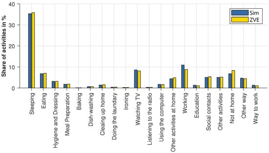 The annual percentage of activities is compared in Figure 6. Most of the activities fit very well. The absolute deviation for almost all activities is significantly below 1%. However, the activities working and not at home have a higher deviation from the ZVE data. By assuming that activities located at home are prohibited during the working-time-blocks, the activity profiles were subsequently edited. This explains the higher proportion of the activity working (absolute deviation is 2%). However, this percentage is then no longer available for the activities clearly located at home, e.g., sleeping. The insertion of missing journeys and the extension of return journeys are carried out at the expense of the activities not at home. This explains the 1.5% lower share of the activities not at home. The activities related to travel fit very well, although the commute was completely inserted afterwards. Excepting the activities working and not at home, it can be concluded that the activity generator reproduces the activities of the original data over the whole year very well. The significant deviations are caused by the restrictions necessary to generate a plausible mobility profile and are therefore tolerated. The remaining deviations are negligible.