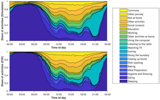 The diagrams of the other types of days are shown in Figure A1, Figure A2 and Figure A3. The top diagram depicts the synthetic activity profiles, while a corresponding diagram for the ZVE-data is plotted below. Immediately noticeable is the smoothing of the synthetic curves. It can be explained by the sample size, because the generated data set contains significantly more day profiles than the ZVE-data set. The comparison confirms the deviations already noted in Figure 6. Not at home is slightly under-, and working is slightly overestimated. However, the temporal progressions match very well.