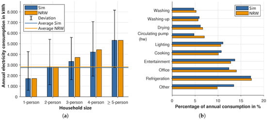 The validation of the activity and the electric model is based on one simulation for 300 houses with 940 Households. Therefore, representative distributions for Germany based on [23] are assumed for the input parameters on household and building levels. The input parameters were already described in Section 2. A whole year is simulated. Concerning activities and electrical behavior, the city category only affects the duration of the commute. The influence is therefore considered negligible and the city category is assumed to be one, i.e., small cities with less than 20,000 inhabitants. The chosen distribution for the input parameters is given in Table A1. The input parameters described in Section 2 are defined based on distributions representative for Germany [36,37]. Thus, a representative German settlement is created. These distributions originate from the already mentioned study ZVE [21] and a population, building, and housing census of the statistical offices of Germany [38]. The values are included in Table A1. Exceptions are the distributions of the number of households within a building, the living space, and the specific heating demand. Those depend on the building type. Therefore, a detailed presentation is omitted at this point. The description of the used methodology to reproduce the distribution for these parameters can be found in [23].