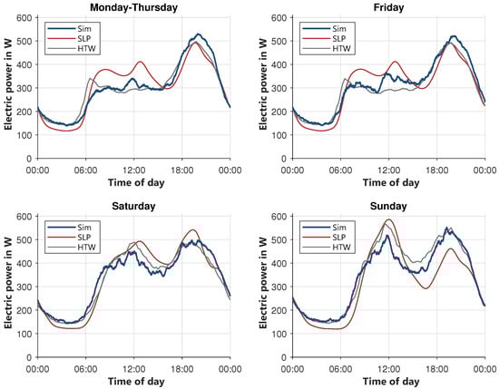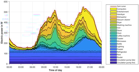 After this process is finished all load profiles of the components are summed up to a household load profile. Electrical load profiles of the circulation pumps for heating and hot water were also added to this household load profile. The pump profiles were modeled with regard to heating demand, as described in [34]. See [23] for a more detailed explanation. At this step, the load profiles of the components and devices were also allocated to the three phases of the electricity system.