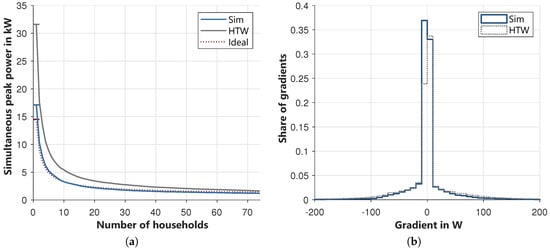 In this section, the results of the electric load model are presented and validated. Different scopes are necessary to fulfill all requirements regarding a realistic load profile for load flow calculations. First, the energy consumption of different households and devices is analyzed. Second, focus is placed upon the shape of an average power profile. Finally, the occurrence of simultaneous power peaks, which are very important for simulations and gradients of the profiles, are discussed. To give an overview of how different a single profile is compared to an SLP, see Figure 8. Figure 8 makes it clear that a single profile has much higher peaks, e.g., profile 1 at around 4 a.m., but that there are times where there is almost no energy demand. This is also the reason why the SLP is not suitable for a detailed simulation of less than around 150 households [6].