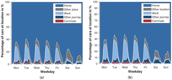 Models like [16,17,18] already used the mobility models to estimate future system perturbation of electromobility. Thus, they combine mobility and electric load profiles in their models. The only model which already combines mobility, heating demand and electric load profiles is [10]. However, the used mobility model is highly simplified and the results are very questionable. It generates an annual driving distance, ranging from 2000 to 18,000 km and averaging 3000 km, for each car present in the model. In comparison, the average value provided by the German Federal Motor Transport is around 14,000 km [20].