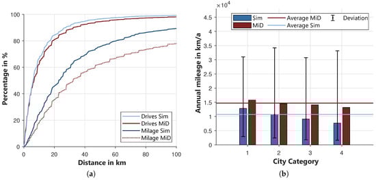To validate the mobility model, a simulation is carried out for each of the four city categories. In contrast to the first simulation, only 107 buildings with 357 households are simulated. Each simulation uses the same distributions already used in the first simulation and representative for Germany. One vehicle is assigned to each household. Thus, only the variable city category is varied. This allows a clear validation of the sensitivity of the city category.