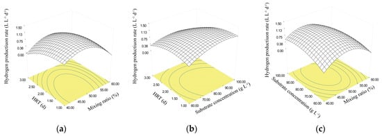 Figure 1c shows the effects of the interaction between the mixing ratio and the substrate concentration on the HPR (at 2 d constant HRT). The HPR first increased, and thereafter, it decreased as the mixing ratio and substrate concentration increased. The contour plot was elliptical, indicating a strong interaction between the two factors.