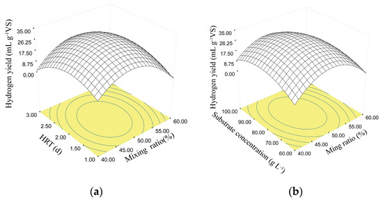 The 3D response surface and 2D contour plots of the HY regression model are shown in Figure 2. With the increasing mixing ratio, HRT, and substrate concentration, the HY increased to an optimal value, and thereafter, it decreased as these three controlling factors increased. The 2D contour plot of HY was elliptical with respect to the mixing ratio and the HRT (Figure 2a) and the substrate concentration and the mixing ratio (Figure 2b), indicating that both have significant interactive effects on HY.