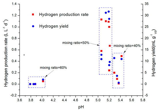 When the HRT was fixed, the HPR first increased slowly, and thereafter decreased rapidly as the mixing ratio increased. When the mixing ratio increased to 50%, the proportion of starch, which constituted a greater fraction of the food waste than it did the cattle manure, increased. Reportedly, readily biodegradable carbohydrates, such as starch, are associated with higher HPR than other substrates [40]. When the mixing ratio exceeded 50%, the alkalinity, which was lower in the food waste than it was in the cattle manure, decreased. The readily biodegradable carbohydrates and the lower alkalinity in the digestion system caused the rapid accumulation of undissolved VFAs, which reduced the pH to below the optimal range [18,23].