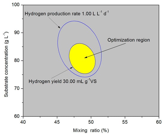In hydrogen-producing reactors, both HPR and HY should be maximized, because high HPRs offer the possibility of reducing the reactor volume and high HYs offer the possibility of improving the energy conversion efficiency. However, it is difficult to optimize these two responses under the same conditions, because their interest regions differ. Therefore, the optimization region was determined by overlaying the responses according to the defined constraints (Figure 4). The constraints used in the overlaying method were to set the HPR and HY in the range of 1.00 L L−1 d−1 to its upper amount and 30.00 mL g−1 VS to its upper amount, respectively. The optimized processing parameters included a mixing ratio of 47% to 51%, a substrate concentration of 76 to 86 g L−1, and an HRT of 2 d. A mixing ratio of 50%, substrate concentration of 80 g L−1, and HRT of 2 d were selected as the optimal parameters to verify the models. The optimal responses were predicted as 1.08 L L−1 d−1 and 30.90 mL g−1 VS for the HPR and the HY, respectively. Under the optimum conditions, the verification experiment achieved an HPR of 1.09 L L−1 d−1 and a HY of 30.22 mL g−1 VS, respectively, which agrees well with the experimental data. This indicates that the models can effectively predict the hydrogen fermentation process, and the optimum conditions obtained using the response surface methodology were conducive to the growth and activity of hydrogen-producing microbes.