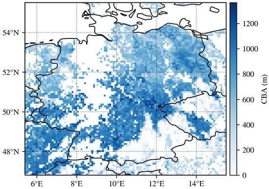 For this study, Meteosat Second Generation (MSG) SEVIRI satellite data from 2014 to 2017, which has a temporal resolution of 15 min and a nominal spatial resolution of 3 km at sub satellite point, were used. This data was processed with the state-of-the-art hybrid fog retrieval algorithm outlined in [] to obtain information on cloud base altitudes (CBA). The algorithm uses a random forest machine learning model trained with cloud base altitudes measured by synoptic weather observation data (SYNOP) and Meteorological Aviation Routine Weather Reports (METAR) stations and the pixel information from the satellite data corresponding to these station locations to predict cloud base altitudes. The general procedure is to train a model for every time slot of the MSG data with station data corresponding to that time where clouds were detected and then predict CBA for the whole MSG scene (see Figure 1 for example scene). This product has been validated extensively using a leave-location-out cross-validation scheme and shows overall good performance with a probability of detection (POD) of 0.61 and a Heidke Skill Score (HSS) of 0.58 []. The CBA data for 2006 to 2017 with a temporal resolution of 15 min is available upon request.