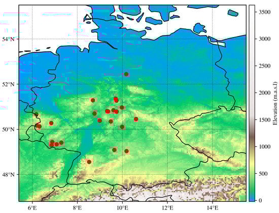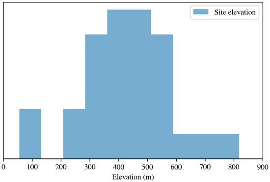Lidar measurements were conducted with Leosphere WindCube v1 and v2 CWDL lidars , which can be set up to measure at up to twelve arbitrary height levels. The focal points of the lidar systems were set to 140 . For this study, time series data from 25 sites (for locations see Figure 2), each with twelve consecutive measuring months, were available. The data for each site contains availability values in percent with a frequency of 10 min for multiple measurement heights up to 200 . Overall, the dataset was comprised of over 5.3 million data points. All sites are situated in Germany at elevations ranging from 61 to 703 a.s.l. (see Figure 3 for height distribution). The availability, henceforth called the 10-min availability, is defined as the percentage of values with a CNR value above the threshold of dB for the respective ten minute interval [,].