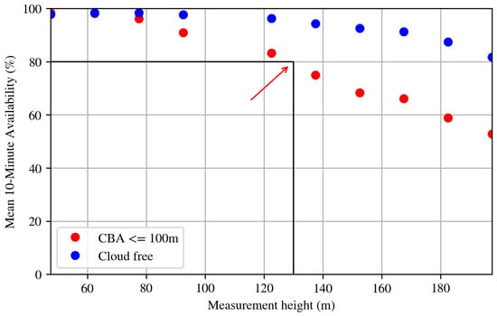 Mean 10-min availability on lidar measurement height above ground for cloud-free cases and situations with cloud base altitudes ≤ 100 . The red arrow marks the measurement height at which 10-min availability is below the 80% threshold in the cloud base altitudes (CBA) ≤ 100 case.