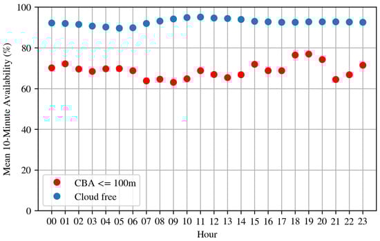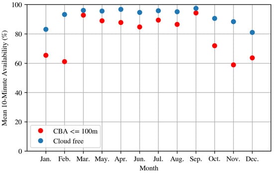For the cloud-free case, the characteristic curve with high 10-min availability at lower measurement heights and the subsequent continuous drop up to the maximum measurement height can be seen. This is due to a higher probability of the CNR value not reaching the threshold to be accepted as valid at higher measurement distances. For the analyzed data set, the average 10-min availability under cloud-free conditions is 97.7% at the lowest measurement height (bin center ), it slightly increases to a maximum value of 98.4% at height bin , and then drops to 81.7% at height bin (blue dots in Figure 4). In contrast to the CBA ≤ 100 situation (red dots in Figure 4), with rising measurement height a sharper drop in 10-min availability, down to 52.8% at height bin , can be observed.