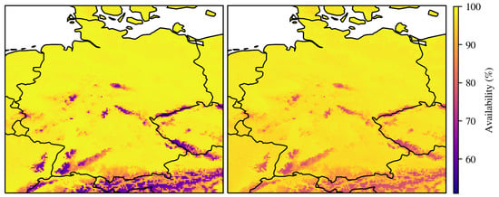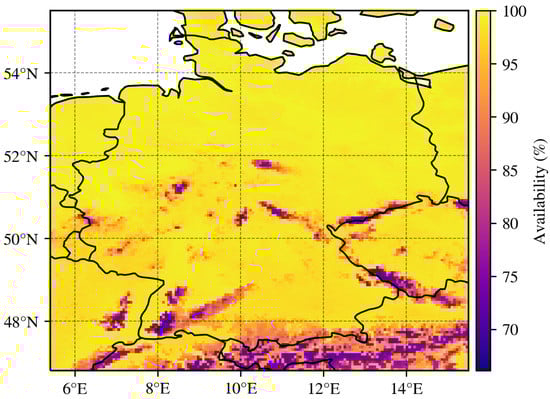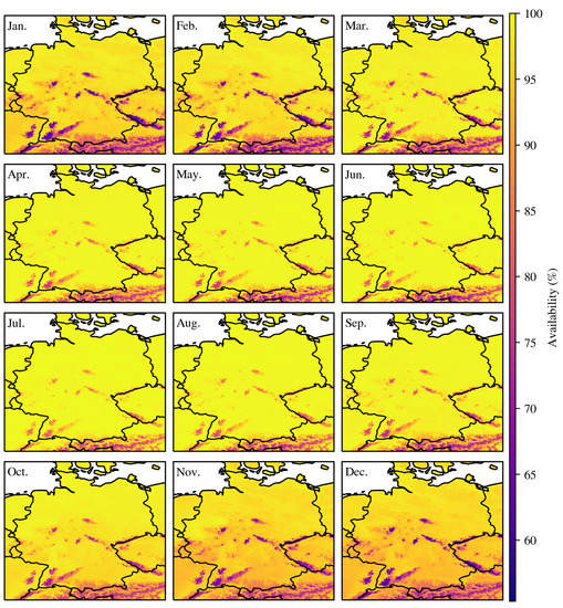 In order to reduce the data loss due to FLS during a complete measurement period, a monthly resolution of spatial availability information is required. Here, the availability reveals a clear seasonal course. The monthly availability maps (see Figure 8) show that during the summer months availability might reach the problematic threshold only at the highest elevations. On the other hand, during all months of the winter half of the year (Oct–Mar) the highest elevations are all below the critical threshold and the availabilities at middle elevations already reach close to critical values of ~85%. Therefore, special care regarding the temporal representativity must be taken when designing measurement strategies for these regions, especially during the winter time. In particular, lower availabilities due to FLS are widely found in central and southern Germany in November and December. This is especially important if the currently necessary 12-month measurement period of the TR-6 (Technische Richtlinie 6) issued by the FGW e. V. (Fördergesellschaft Windenergie und andere Dezentrale Energien) [] used in Germany might be relaxed in the future in favor of shorter measurement periods combined with timely extrapolation.