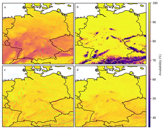 The annual availability map for Germany and surrounding areas reveals that the lower mountain ranges and the alpine region generally show availabilities which reach the critical level of 80% (used, for example, in []) or even below Figure 7). Hotspot areas of critical availability are the lower mountain ranges of the Black Forest, Vosges mountains, the Swiss Jura, and the Swabian Alps in the south, but also some more northerly mountain ranges like the Thuringian Forest, Röhn, Spessart, the Harz Mountains, as well as the northwestern mountain areas of Hunsrück, Taunus, and the Rothaar Mountains. While the lowlands of Germany generally show higher availability ≥ 80%, it should be kept in mind that the maps only show the expected availability with regard to the frequency of conditions with clouds of base altitude of 100 and below. Other factors, such as exceptional clean air periods (low aerosol backscatter), can further reduce the availability of lidar wind measurements even under cloud-free conditions [].