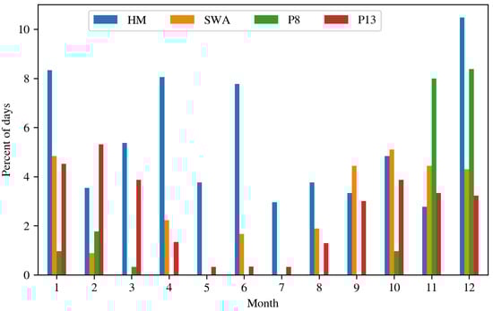 In extreme cases of persistent ground fog frequently occurring in the winter half year, as shown in Figure 10a, measurement availability can be heavily impacted. While on average (over a twelve year period) this fog pattern has a very low occurrence for most of the year, during the winter months, and especially in November and December, these extreme conditions can be observed on almost 10% of the days (see Figure 11) and may significantly lower the monthly availability during a measurement campaign conducted even in terrain with lower elevations. On the other hand, as can be seen in Figure 10b, other extreme conditions only affect areas with higher elevations like the lower mountain ranges. The fog patterns P8 and P13 in Figure 10a,b are based on a self-organizing map approach assigning daily averaged fog frequency maps to specific fog patterns which is presented in []. Figure 10c (“high over central Europe” (HM) weather type) and Figure 10d (“anticyclonic southwesterly” (SWA) weather type) show the average availabilities of two general weather situations (GWS), based on the work in [], commonly associated with favorable conditions for lowland radiative fog. It can be seen that, while not reaching the critical 80% threshold, availability reductions can be expected in low elevation areas. While these situations also occur a little more often during the winter time (close to 20% of days), Figure 11 shows that they can also be observed on a significant amount of days during the summer months. Thus, while planning measurement campaigns, reductions due to certain weather situations should be taken into account as a factor for reduced availability.
