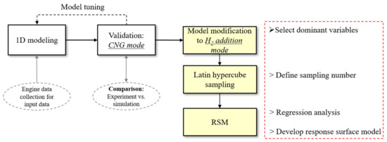 Here, the LHS is very effective in developing the first- and second-order responses for regression model development with minimal numerical or experimental data sampling points. Based on the LHS method, regression analysis employing the radial basis function is performed to generate the response surface. Figure 1 shows the overall process for the present research. More detailed explanations for DoE and LHS for engine analysis are thoroughly described in our previous work [17,19,23,24].