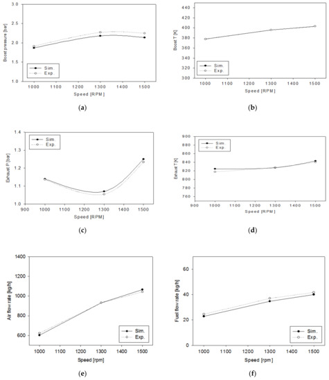 Validation results for thermodynamic and fluidic properties at engine components: (a) boost pressure@upstream of intercooler; (b) boost temperature@upstream of intercooler; (c) exhaust pressure@upstream of turbine; (d) exhaust temperature@upstream of turbine; (e) air flow rate; (f) fuel flow rate.