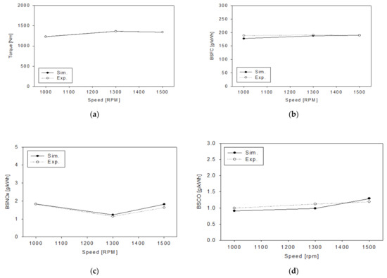 Validation results for engine performance and emission: (a) brake torque; (b); BSFC; (c) BSNOx; (d) BSCO.