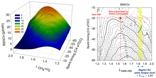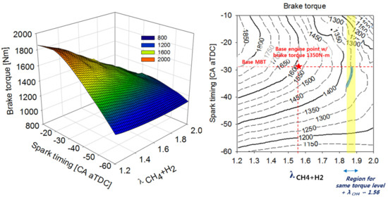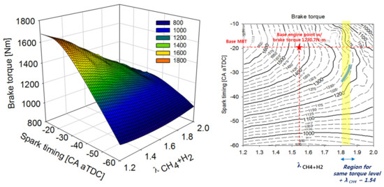 Figure 8, Figure 9 and Figure 10 show the RSM derived at 1300 rpm full load in terms of brake torque, BSFC, and BSNOx, respectively. Figure 8 shows the results of brake torque under a 1300 rpm full-load condition derived from the LHS-based DOE. The figure indicates that with the addition of hydrogen, the MBT is attained, and the torque decreases thereafter over the entire area of the variable spark sweep timing. Moreover, to achieve the same torque (1350 N∙m) as that of the base engine, a more advanced MBT appears upon hydrogen addition; it is also possible to implement the same torque (blue line in figure) as that of the base engine in an advanced state in areas other than the MBT point. According to Figure 4, when the total lambda remains equal to the base engine lambda of 1.56 as shown in Table 2, that is, if the MBT advances between 1.85 and 1.9 of the methane-based lambda, the same torque as that of the base engine can be achieved.