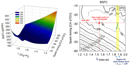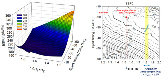 Figure 9 shows the results of BSFC under a 1300 rpm full-load condition derived from the LHS-based DOE. When compared with the brake torque, the BSFC rate exhibits a reverse contour shape and is observed to be considerably related to the torque. When expressed in the form of a two-dimensional contour graph, the fuel efficiency tends to increase as hydrogen addition increases, which is a mass substitution effect that occurs when hydrogen occupies the methane fraction of the main fuel. It is further observed that brake specific fuel consumption can be improved even with the addition of a small amount of hydrogen because this gas possesses a large volumetric lower heating value. Moreover, advanced spark timing under hydrogen addition can cause higher power output. To achieve the same torque level (blue line in figure) as that of the base engine, a similar fuel efficiency can be realized regarding the more advanced MBT via hydrogenation and by controlling the spark timing in the vicinity of the MBT as hydrogen is added; this indicates the possibility of achieving a better fuel consumption rate. Based on Figure 4, when the total lambda remains equal to 1.56 of the base engine lambda, that is, if the MBT condition is between 1.85 and 1.9 of the total lambda, then the same level of BSFC as that of the base engine can be achieved.