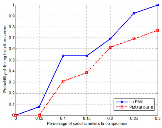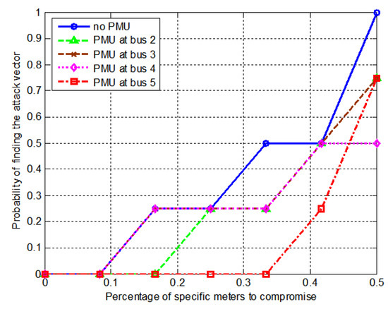 Thus, 4 PMUs are required for full observability under cyber security achievement without conventional meters. In the case of full observability under cyber security with conventional meters, 1 required PMU could be obtained. Checking the redundancy of matrix in this system, it could obtain vulnerable locations B7 and B8 in branch 7–8. The placement of a secure PMU at bus 8 made the power grid completely secure from false data injection attacks because the matrix has a full degree of redundancy, i.e., all . For evaluation, the metrics of probability of finding attack vectors are shown in Figure 4.