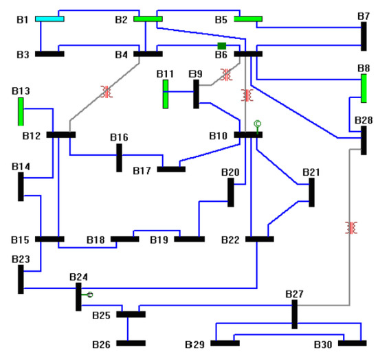 Figure 5 shows the IEEE 30-bus system. The IEEE 30-bus system consists of 30 buses, 41 branches and 6 generators with reference bus B1.