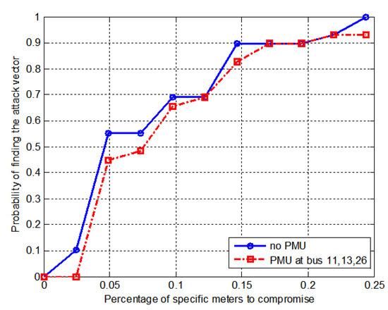 Thus, 10 PMUs are required for full observability considering cyber security achievement without conventional meters. In the case of full observability considering cyber security with conventional meters, 3 required PMUs could be obtained. Checking the redundancy of matrix in this system, it could obtain vulnerable locations, B9, B11, B12, B13, B25 and B26. The secure PMU candidate placement sets are (B9, B12, B25), (B9, B12, B26), (B11, B13, B26), (B9, B13, B25), (B9, B13, B26), (B11, B12, B25), (B11, B12, B26) and (B11, B13, B25). The placement of PMU at buses (B11, B13, B26) made the power grid completely secure from false data injection attacks because matrix has a full degree of redundancy, i.e., all . For evaluation, the metrics of the probability of finding attack vectors are shown in Figure 6.