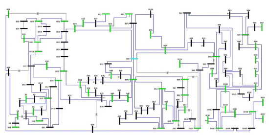 Figure 7 shows the IEEE 118-bus system. The IEEE 118-bus system consists of 118 buses, 186 branches and 54 generators with reference bus B1.
