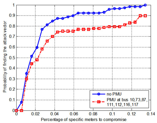 As a result, 32 PMUs are required for full observability considering cyber security achievement without conventional meters. In the case of full observability considering cyber security with conventional meters, 7 required PMUs could be obtained. Checking the redundancy of matrix in this system, it could obtain the following vulnerable locations, B8, B9, B10, B12, B68, B71, B73, B85, B86, B87, B110, B111, B112, B116 and B117. The placement of PMUs at buses (B10, B73, B87, B111, B112, B116, B117) makes the power grid completely secure from false data injection attacks because matrix has a full degree of redundancy, i.e., all . For evaluation, the metrics of probability of finding attack vectors are shown in Figure 8.
