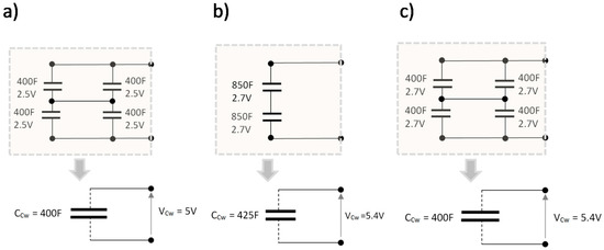 It should be noted that in series parallel arrangement Figure 1b with the same values, the equivalent ESRCw (equivalent series resistance) value of the energy storage will have approximately the ESRsc of a single supercapacitor, whereas the equivalent resistance in series arrangement will be approximately two times the ESRsc value of a single supercapacitor. This is very important from the point of view of the current efficiency of the energy storage in the event of loading it with a high-current pulse receiver.