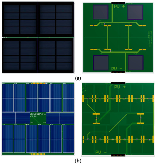 Visualization of printed electric board with photovoltaic elements. (a) PV system in parallel–series connection, (b) series connection of 14 PV elements in top view (left side) and bottom view (right side).