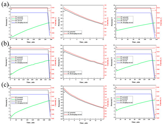 The tested PV panels were measured three times; then, the average values of parameters were determined and the average current–voltage characteristics were plotted. The results of the average measurements are shown in Figure S10. All investigated PV solar cells exhibited good photovoltaic parameters suitable for construction of energy storage systems based on supercapacitors. In the next step of our work, we tested three demonstrators under charging supercapacitors to VCw, under discharge of supercapacitors to VCw = 2 V, and under second charging supercapacitors to VCw (see Figure 5).