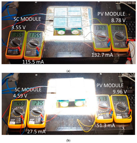 In this work, as it was mentioned previously, three demonstrators based on silicon solar cells and supercapacitors were constructed and analyzed in detail. In the first demonstrator, the photovoltaic panel (PV) consists of 40 cells connected in series–in parallel in a two in parallel connection of two in series connected smaller modules (10 cells per module connected in series) (2 × 10 × 2 system) and a block of current source, voltage control system, and four supercapacitors in series/in parallel with a capacity of CSC = 400 F each and operating voltage VSC = 2.5 V each was constructed as presented in Figure 3a. In the first demonstrator, the supercapacitors with a capacity of CCw = 400 F and a working voltage of VCw = 5 V were used. In the second demonstrator, the PV panel in a system of 40 cells (connected in series–in parallel in a 2 × 10 × 2 system) and a block power source, voltage control system, and two supercapacitors in series with a capacity of CSC = 850 F and operating voltage VSC = 2.7 V each were created as is shown in Figure 3b. In the second demonstrator, the supercapacitor with a capacity of CCw = 425 F and a working voltage of VCw = 5.4 V was applied. In the third demonstrator, PV cells in a system of 14 cells connected in series in a system of 14 × 1 and four supercapacitors with a capacity of CSC = 400 F and operating voltage VSC = 2.7 V were created (see Figure 3c), giving CCw = 400 F and VCw = 5.4 V for supercapacitors’ connection.