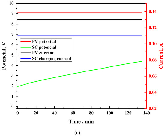 The performance of the energy storage unit was tested after three months from the initial experiment. No significant changes were observed (Figure 7). Only a small deviation from previous results was noticed, caused mainly by soldering additional wires used to register the level of the supercapacitor charge on the electric board.