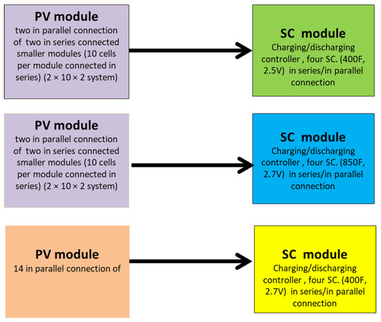 Scheme 1. Graphical representation of different architecture studied in the current work. - Experimental measurements of the properties of individual elements contained in three types of demonstrators, including current–voltage characteristics of photovoltaic systems and charging and discharging characteristics of supercapacitors.
