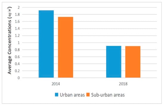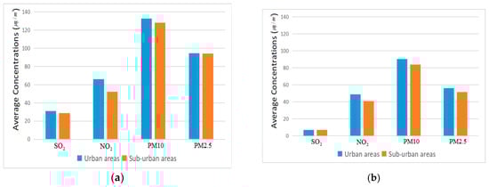 Average air pollution levels between urban and sub-urban areas in 2014 and 2018. (a) Average air pollution levels between urban and sub-urban areas in 2014, (b) Average air pollution levels between urban and sub-urban areas in 2018.