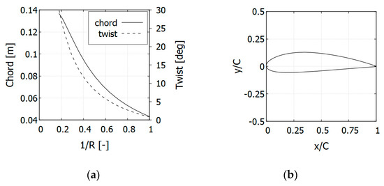 Twist and chord distributions (a); selected airfoil NACA 4418 (b).