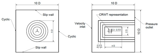 The computational domain has a cubic shape with dimensions of 10 D × 10 D × 10 D, where D = 1.4 m is the rotor diameter. Domain with applied boundary conditions has been schematically presented in Figure 2. It consists of several cylindrical grid refinement regions. They were introduced to provide a sufficient mesh density around the wind turbine model while keeping total element count relatively low (9,572,739 elements in total). At each domain’s border, there is 50 elements with edge size of 0.28 m. There are four refinement regions. In the turbine, proximity edge size is equal to 0.0175 m. In all studied cases, the uniform wind velocity at the inlet is equal to 8 m/s.