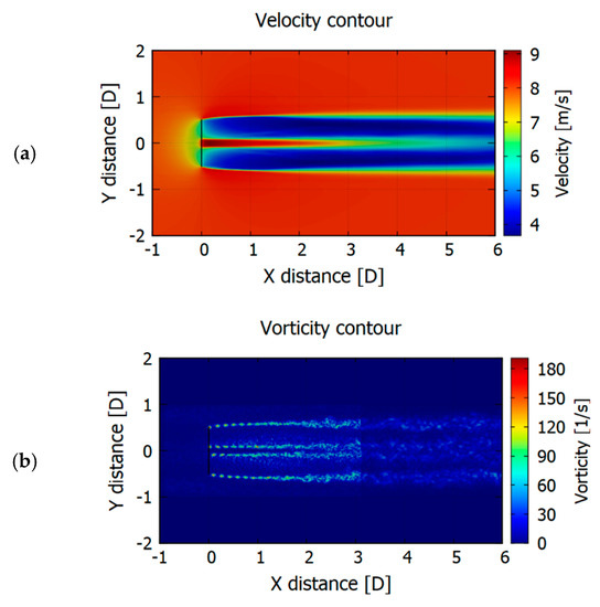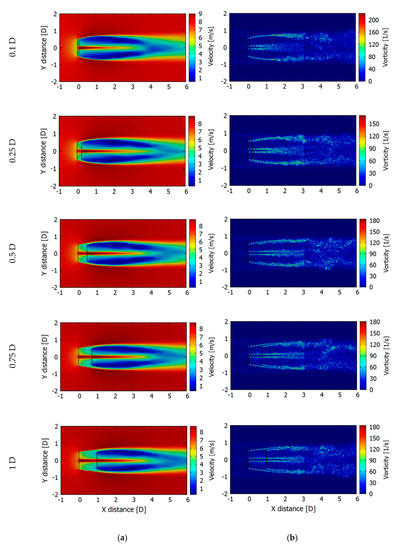 In Figure 13, contours for mean wind speed (averaged from 3 s to 5 s) and vorticity are presented. For comparison, the same operational point for each configuration is plotted. Rotors are exactly counter-rotating with TSR = 5. High thrust, and thus largely expanded wake can be clearly noticed. A large reduction in a wind velocity is observed right behind the rear rotor. The aerodynamic wake seems to be similar for all the cases, with a tendency to be more coherent with rotors separation rising. Wake loses its stability around 2 D behind the second rotor. Unphysical transition in the vorticity at distance 3 D behind first rotor is visible. It is related to an end of the finest grid region. Even if it can be considered as a near wake region, it should not affect a power performance or its effect would be negligible.