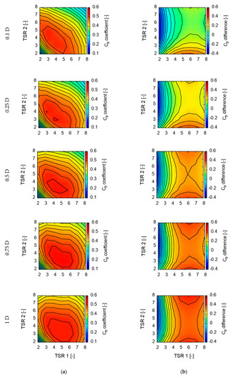 Maps of total power coefficient Cp (a) and the difference in Cp between rotors (b).