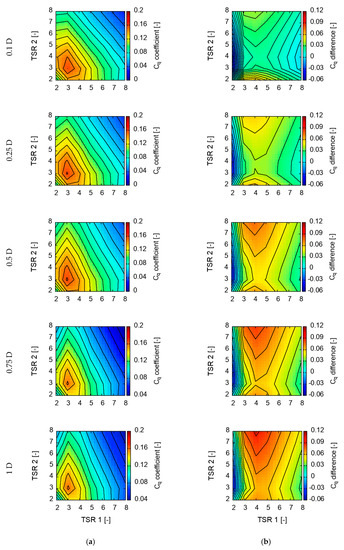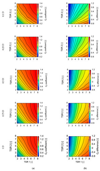 Results of simulations were collected and presented in the form of maps. Calculated power, torque, and thrust coefficients were plotted in a function of front and rear rotors’ TSR. Additionally, the differences between those values for both rotors were plotted as well. Value maps are presented in Figure 6, Figure 7 and Figure 8. Results analysis helped to find the best configuration and operational point for CRWT. Thanks to the utilization of a transient solver, interactions between rotors could be observed and analyzed. Obtained fields contours were discussed as well. In the following sections, the term “configuration” relates to the distance between rotors, while the term “operational point” relates to the values of TSR for the front (TSR1) and rear (TSR2) rotor in a certain configuration.