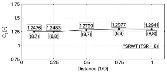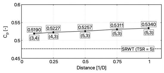 - highest power coefficient was observed in the configuration where rotors were separated by distance 1 D, the front rotor was operating with TSR = 5 and rear one with TSR = 3. In this configuration increase in Cp value, in comparison to SRWT, is significant and equals to 12.02%. The lowest increase in Cp was obtained in configuration 0.1 D (8.87%). TSR in optimal operational point for this configuration was equal to 3 and 4 for the front and rear rotor, respectively;