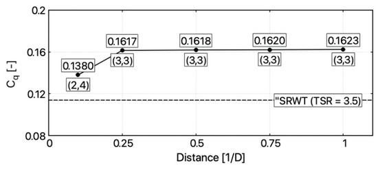 The optimal values of power, torque, and thrust coefficients for each studied configuration are presented in Figure 9, Figure 10 and Figure 11. Rotors’ TSR at these operational points are marked as well. The following are the main results analyses findings: