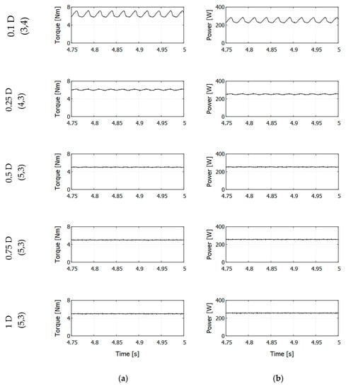 In Figure 12, the generated total torque (left-hand side) and power (right-hand side) have been plotted. For each configuration, optimal operational points have been presented in terms of Cp. The plot from a simulation last quarter of a second is shown (from 4.75 s to 5 s). State of the model in that period is considered to be very stable and steady. The selected period represents slightly more than 2 revolutions for rotor operating with TSR = 5.