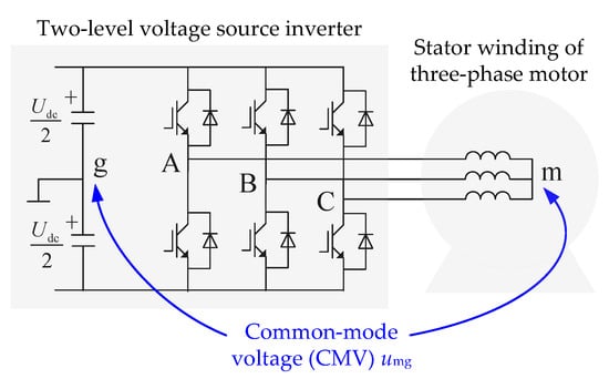 It is well known that the use of AC drives can achieve high efficiency and energy saving [1]. In AC drives, a three-phase motor fed by a two-level voltage source inverter has found widespread application [2]. At present, the dominant control strategy of the voltage source inverter is pulse width modulation (PWM) strategy. Among all the PWM methods, the space vector PWM (SVPWM) method is an advanced method due to its superior performance characteristics [3]. However, the conventional SVPWM has the problem of large magnitude and high frequency of common-mode voltage (CMV) [4]. The CMV magnitude is equal to Udc/2 (Udc is the DC bus voltage value of the inverter), and the CMV frequency is equal to the switching frequency of the inverter, from several kHz to tens of kHz [5]. The CMV with large magnitude and high frequency brings adverse effects on the drive system, such as winding insulation deterioration, shaft voltage, leakage current, electromagnetic interference, etc., and therefore in high-performance AC drives it is necessary to reduce the CMV [6,7,8].
