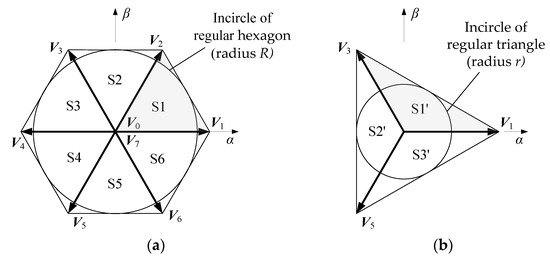 In the conventional SVPWM, the α-β plane is divided into six sectors with six non-zero vectors as boundary, which are labeled S1 to S6 in Figure 2a [20]. In each sector, three vectors are used for voltage-second synthesis: the non-zero vector located at the beginning boundary of the sector, the non-zero vector located at the end boundary of the sector, and the null vectors V0 or V7. Due to the use of null vectors, the CMV magnitude is up to Udc/2. In comparison, in the AZSPWM, NSPWM, and VSVM, the null vectors are no longer used, therefore the CMV magnitude is reduced to Udc/6. However, although the CMV magnitude decreases, the CMV frequency does not decrease which is still almost as high as the switching frequency of the inverter.