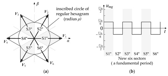 In order to increase the maximum linear output voltage, the SVPWM by only using V1, V3, V5 and the SVPWM by only using V2, V4, V6 are combined to form the common-mode reduction SVPWM (CMRSVPWM). The α-β plane is divided into new six sectors, which are labeled S1″ to S6″ in Figure 3a. Comparing the six sectors in Figure 3a with those in Figure 2a, we can see that by turning the six sectors of conventional SVPWM anticlockwise by 30°, new six sectors are get. In odd-numbered sectors S1″, S3″, S5″, three non-zero vectors with odd subscripts V1, V3, V5 are used for synthesis, while in even-numbered sectors S2″, S4″, S6″, three non-zero vectors with even subscripts V2, V4, V6 are used for synthesis. The activation durations of three non-zero vectors in each switching period in each sector are similar to (3).