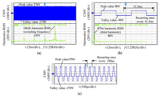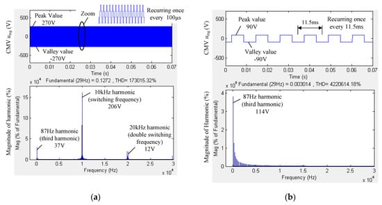 In the upper right corner of Figure 4a, a CMV zoom figure is shown. Inspection of the figure indicates that the pulse of CMV waveform recurs once every 100 μs, which indicates the frequency is 10 kHz that equals the switching frequency of the inverter. While from Figure 4b it is apparent that the pulse of CMV waveform recurs once every 11.5 ms, which indicates the frequency is 87 Hz that equals the triple fundamental frequency (the fundamental frequency refers to that of the inverter output voltage, that is, the reference vector rotation frequency), far less than the switching frequency of the inverter.