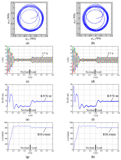 Simulation waveforms of flux, current, torque and speed in two methods. (a) Stator flux trajectory in conventional SVPWM; (b) Stator flux trajectory in CMRSVPWM; (c) Stator currents in conventional SVPWM; (d) Stator currents in CMRSVPWM; (e) Electromagnetic torque in conventional SVPWM; (f) Electromagnetic torque in CMRSVPWM; (g) Rotor speed in conventional SVPWM; (h) Rotor speed in CMRSVPWM.