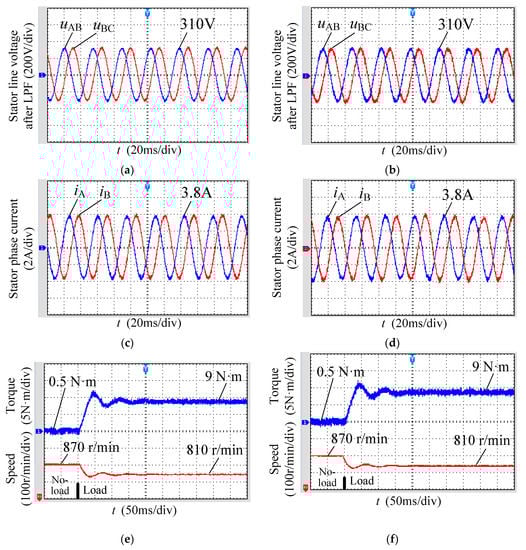 Figure 8a,b show the stator line voltages uAB and uBC after LPF in two methods. They are all sine waves with an amplitude of about 310 V, a frequency of 29 Hz, a phase difference of 120°. There is no low-order harmonic such as 3rd, 5th, 7th. Figure 8c,d show the stator phase current iA and iB in steady state after loading in two methods. They are all sine waves with an amplitude of about 3.8 A, a frequency of 29 Hz, a phase difference of 120°. There is also no low-order harmonic such as 3rd, 5th, 7th. Figure 8e,f show the electromagnetic torque and rotor speed before and after loading in two methods. The transition process is about 150 ms, and the steady state torque and steady state speed are very stable. In addition, due to the open-loop experiments, there is a speed drop, and a speed feedback control can reduce or eliminate the speed drop.